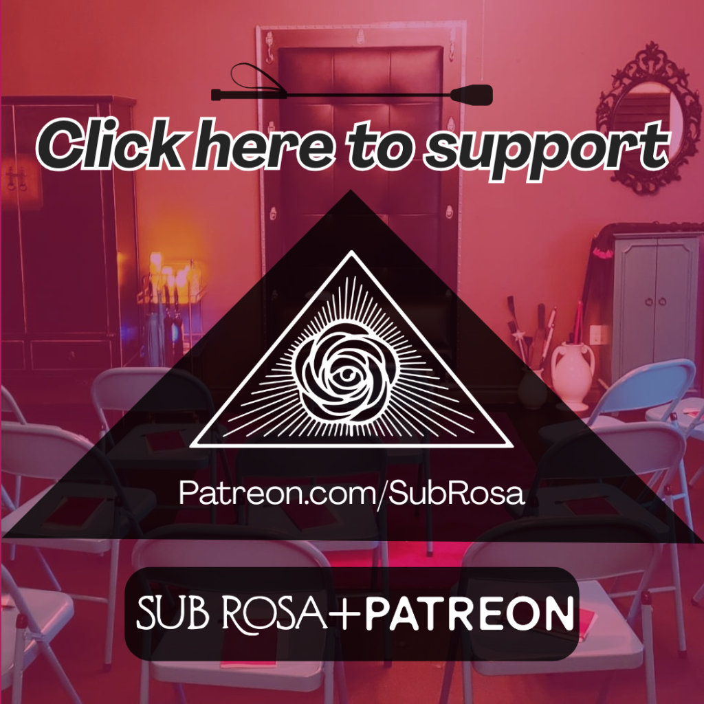 If you’d like to celebrate Sub Rosa all year long, our Patreon is a lovely way to do so. Patreon supporters help with all the unseen operating costs of running a kinky small business, from supplementing our community discounts to special projects and upgrades to the space.